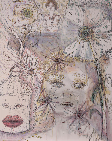 Katherine has created a symbolic visual language, a mark-making short-hand of outlines and apparitions, via oil paint, across the canvas surface - spots, spirals, faces, flowers, snails, shells, bow-ties and ribbons - appear atomised or vaporised in a swirling vortex of texture and form.